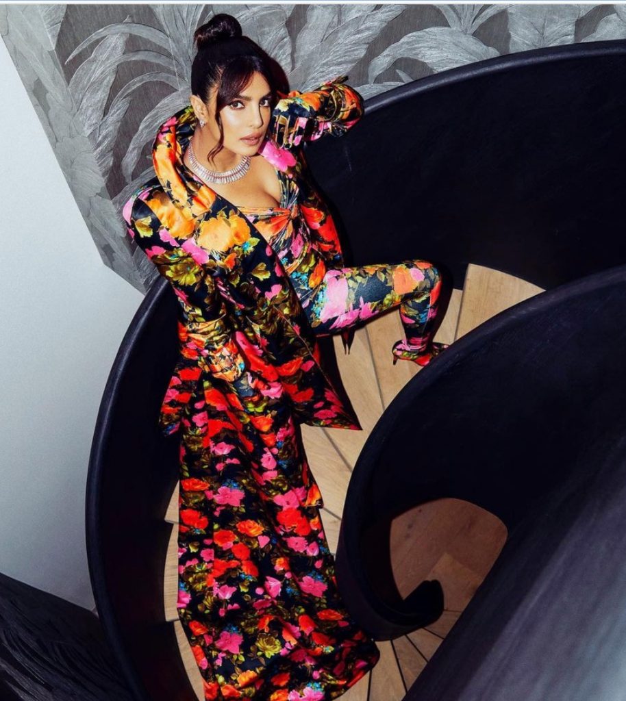 इंटरनेशनल क्वीन ने रेड कार्पेट के लिए नॉट-स्टाइल टाई के साथ फुल फ्लोरल फिटेड कैटसूट चुना। प्रियंका चोपड़ा जोनास ने लुक को और निखारने के लिए फ्लोर-स्वीपिंग लॉन्ग ट्रेन की विशेषता वाले मैचिंग कोट के साथ सूट को स्टाइल किया।