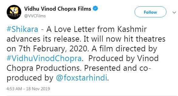 यह खुशखबरी साझा करते हुए, निर्माता लिखते है,”#Shikara – A Love Letter from Kashmir, now coming to you sooner than you’d expected. Releasing on 7th February, 2020 in a theater near you.
